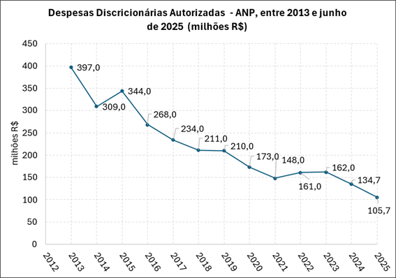 A ANP vem sofrendo restrições orçamentárias recorrentes nos últimos anos. Corrigida pelo IPCA, a autorização para despesas discricionárias caiu de R$ 749 milhões em 2013 (valor corrigido pela inflação) para 134 milhões em 2024 (-82%).